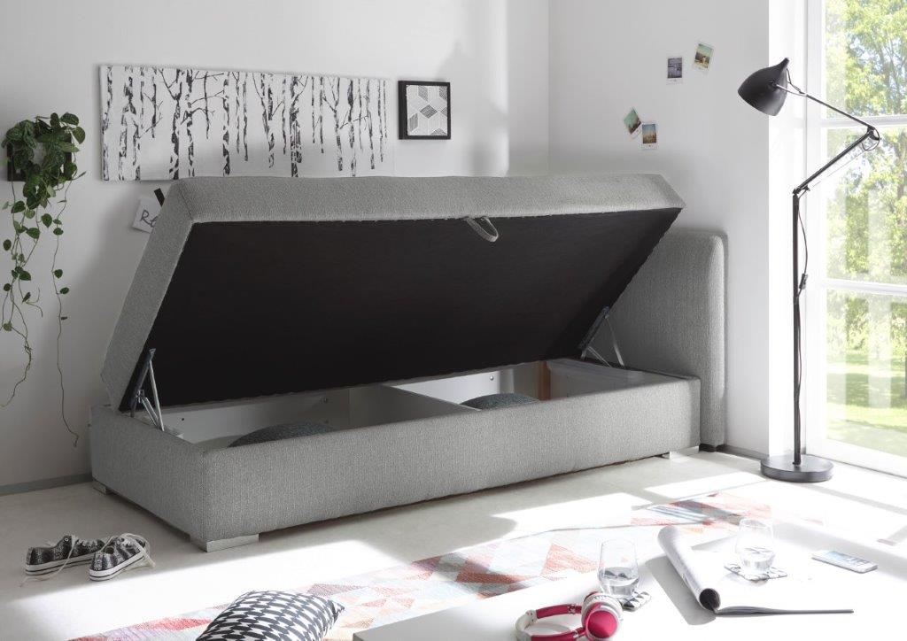 Łóżko posiada pojemnik na pościel wyposażony w sprężyny pneumatyczne